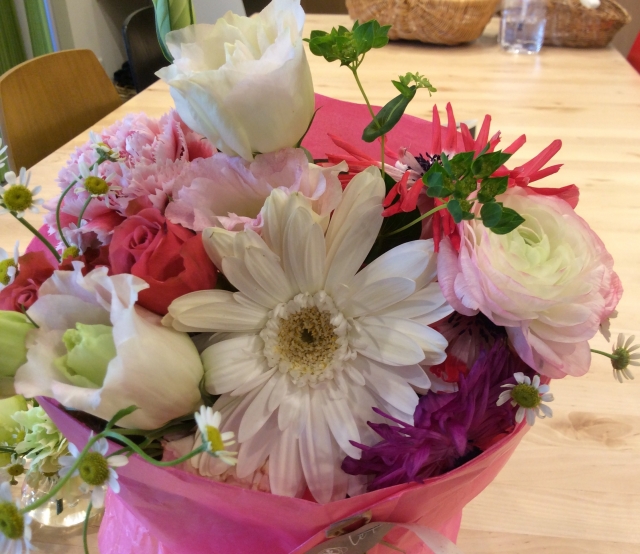 送別会らしさが一番出るのが花。写真にも映えるし、その場が華やかになります。